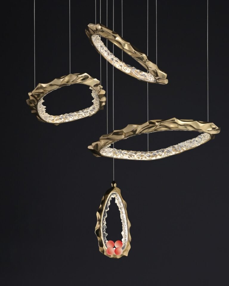 Lysara Éclat is a luxury chandelier crafted from golden copper with faceted silicon crystal diffusers. Its sculptural rings shimmer with brilliance, transforming light into a radiant centerpiece for refined interiors.